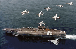 Approaching the Kitty Hawk on its portside, the Sammy conducted a "Barrel Roll" (Flank Bell at a full right rudder as we passed in front of the Kitty Hawk. The Skipper ordered the launch of "Green Smoke Flares" from the Three-Inch launchers, signifying that the aggressor's torpedoes had been fired at the Carrier. During this maneuver, the OOD snapped a number of periscope photographs documenting the flares as they bounced down the flight deck. To our delight, the pictures clearly showed the "Deck Crew" running for cover as the flares bounced down the flight deck; that was truly a magnificent sight to behold.